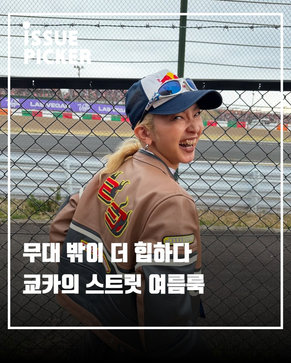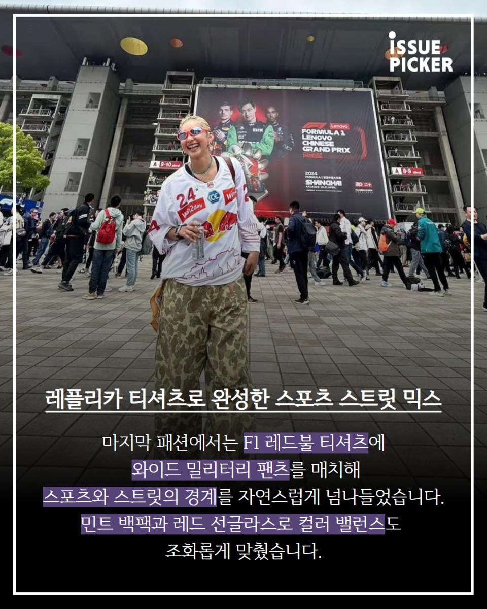 또한 레플리카 티셔츠로 완성한 F1 감성의 스포츠 스트릿 믹스도 빼놓을 수 없죠! 레드불 티셔츠🏁와 와이드 밀리터리 팬츠, 민트 백팩🎒과 레드 선글라스로 컬러 밸런스까지 완벽하게 조율된 룩✨