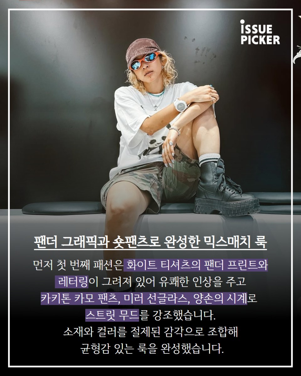 팬더 그래픽이 귀여운 화이트 티셔츠🐼에 카키 카모 팬츠🫡, 미러 선글라스🕶️까지—과감한 조합 속에서도 절제된 감각으로 균형을 잡은 스타일이 인상적이에요. 시계 두 개로 마무리한 디테일까지 스트릿 무드 완성! ⌚⌚