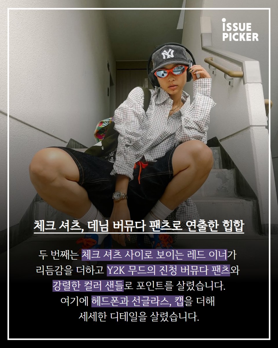 레드 이너가 살짝 보이는 체크 셔츠와 진청 버뮤다 팬츠👖, 여기에 강렬한 컬러의 샌들🟥, 헤드폰🎧과 캡🧢까지—힙합 감성이 터지는 디테일 하나하나가 눈을 사로잡습니다.