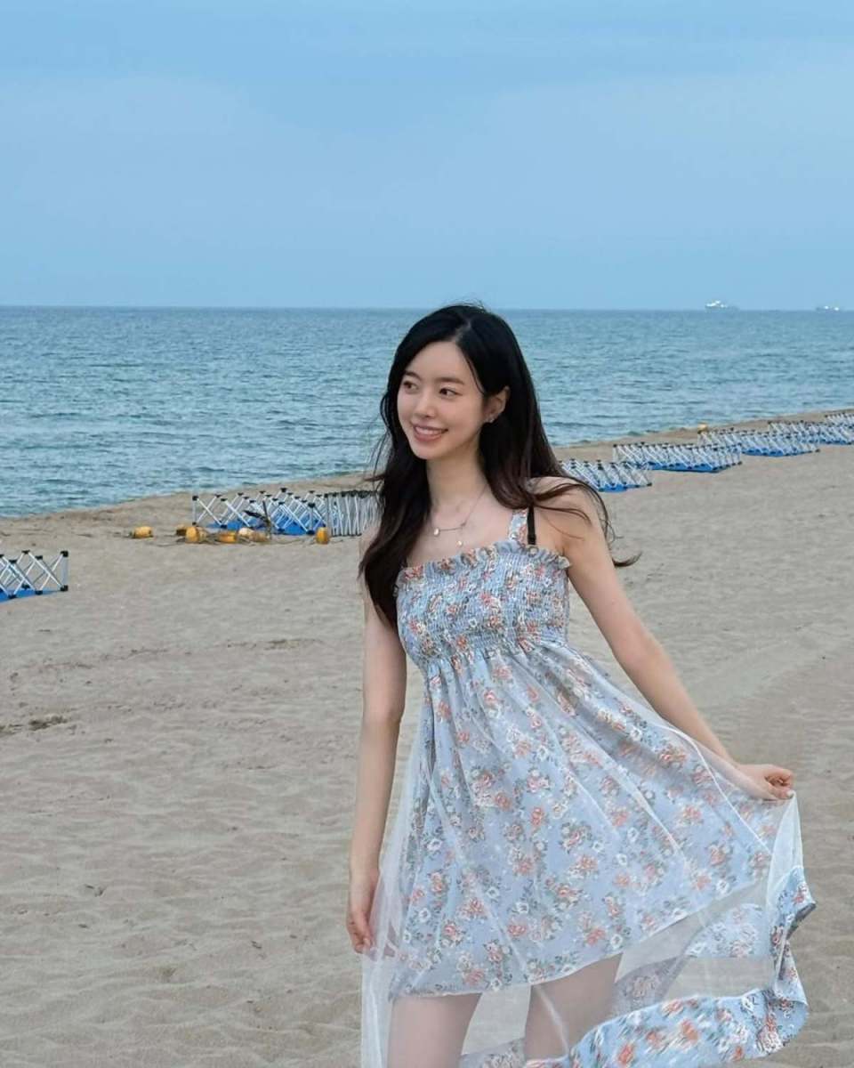 반면 두 번째 사진에서는 완전히 다른 분위기를 연출했다. 바닷가를 배경으로 한 그는 은은한 파스텔 컬러 바탕 위에 플라워 패턴이 가득 들어간 원피스를 선택했다. 상체는 스모킹 디테일로 몸에 안정감 있게 밀착되며 얇은 어깨 끈이 여름의 시원한 무드를 더했다. 시폰 소재의 가벼움은 바닷바람에 흩날리며 청량한 분위기를 완성했고 A라인 밑단은 걸을 때마다 자연스럽게 흔들려 로맨틱한 매력을 더했다.