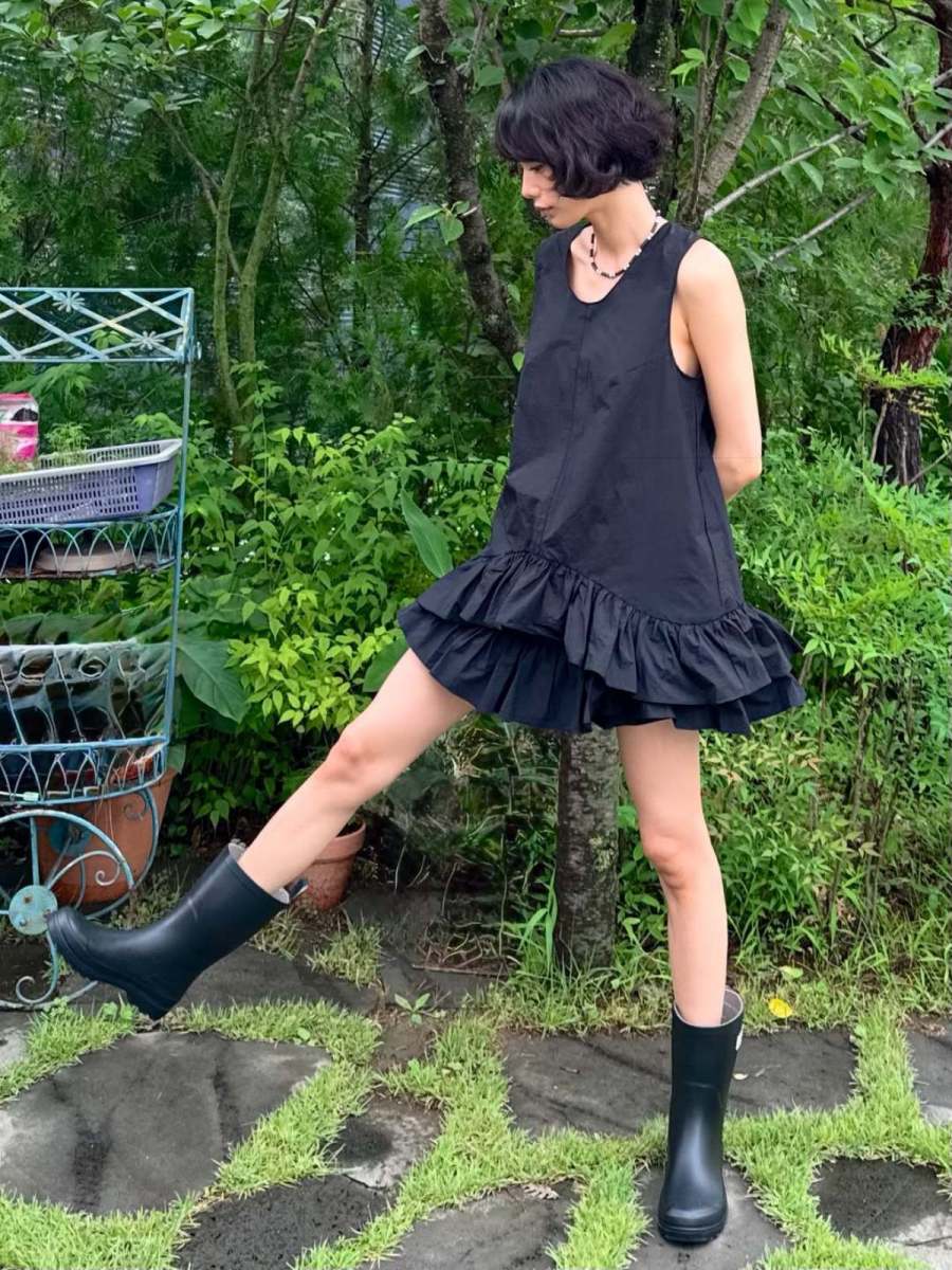 첫 번째 룩은 블랙 민소매 원피스와 레인부츠의 조화가 돋보인다. 밑단에 러플 디테일이 더해진 원피스는 단색임에도 불구하고 볼륨감을 더해 입체적인 실루엣을 완성했다. 여기에 무릎 아래까지 오는 블랙 레인부츠를 매치해 시크하면서도 거친 무드를 동시에 담아냈다. 심플한 네크리스 하나로 포인트를 줘 과하지 않으면서도 시선을 잡아끌었고 전체적인 블랙 톤은 분위기를 정돈하며 도시적이면서도 자연 속에서 잘 어울리는 균형을 만들었다.