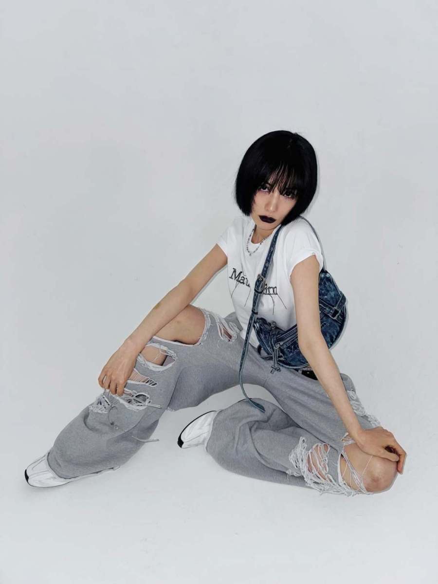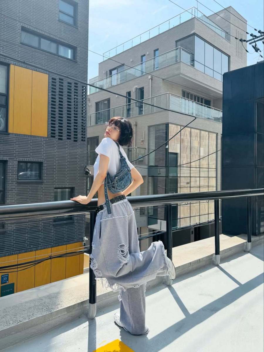 두 번째 룩은 화이트 크롭 티셔츠와 찢어진 와이드 팬츠로 완성한 스트리트 패션이다. 짧은 티셔츠는 탄탄한 몸선을 강조했고 바닥에 끌릴 듯 루즈한 팬츠는 과감한 컷팅으로 개성을 드러냈다. 블랙 스터드 벨트와 청 소재 백팩은 이 룩의 완성도를 높이며 반항적인 무드를 한층 강화했다. 발에는 화이트 스니커즈를 매치해 전체적인 균형을 유지했다. 이 조합은 Y2K 감성과 현대적인 스트리트 무드가 자연스럽게 결합된 사례로 자유분방하면서도 세련된 분위기를 연출한다.