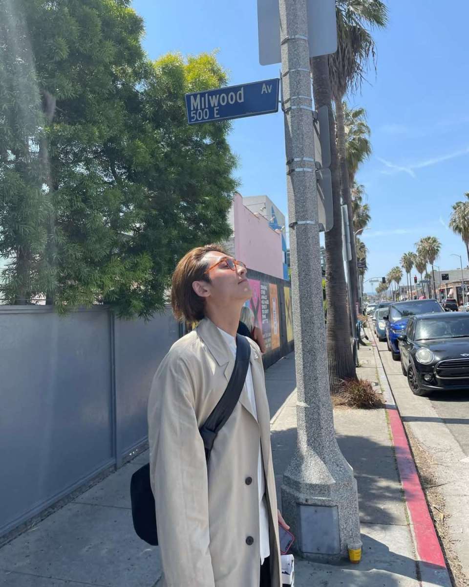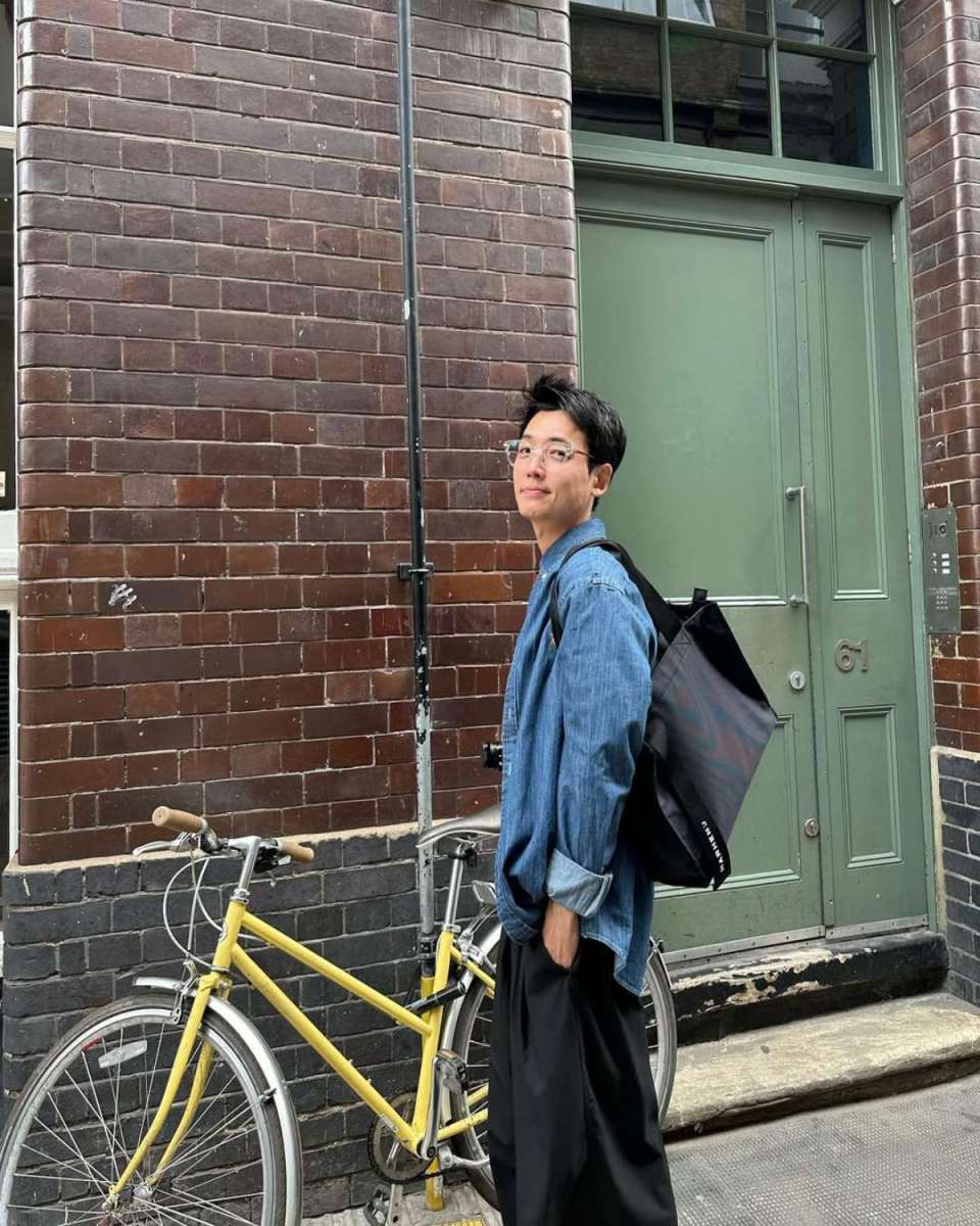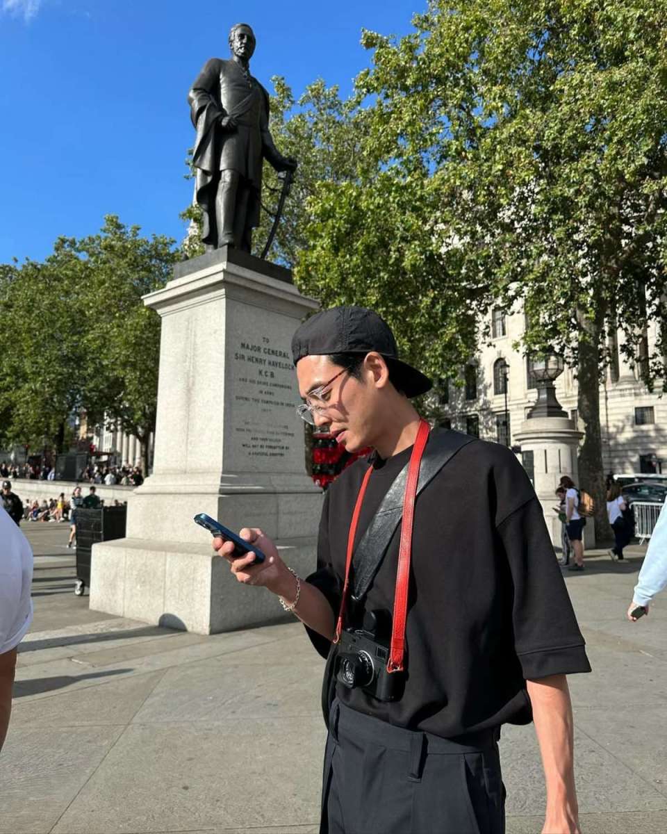 두 번째 사진은 런던 타워브리지를 배경으로 한 장면이다. 이곳에서는 편안하면서도 컬러 조합이 돋보이는 스타일링이 눈길을 끈다. 청남방을 겹쳐 입은 그는 캐주얼하면서도 자유로운 이미지를 연출했다. 안쪽에는 붉은 기운이 감도는 티셔츠를 더해 색상 대비가 부드럽게 살아난다.