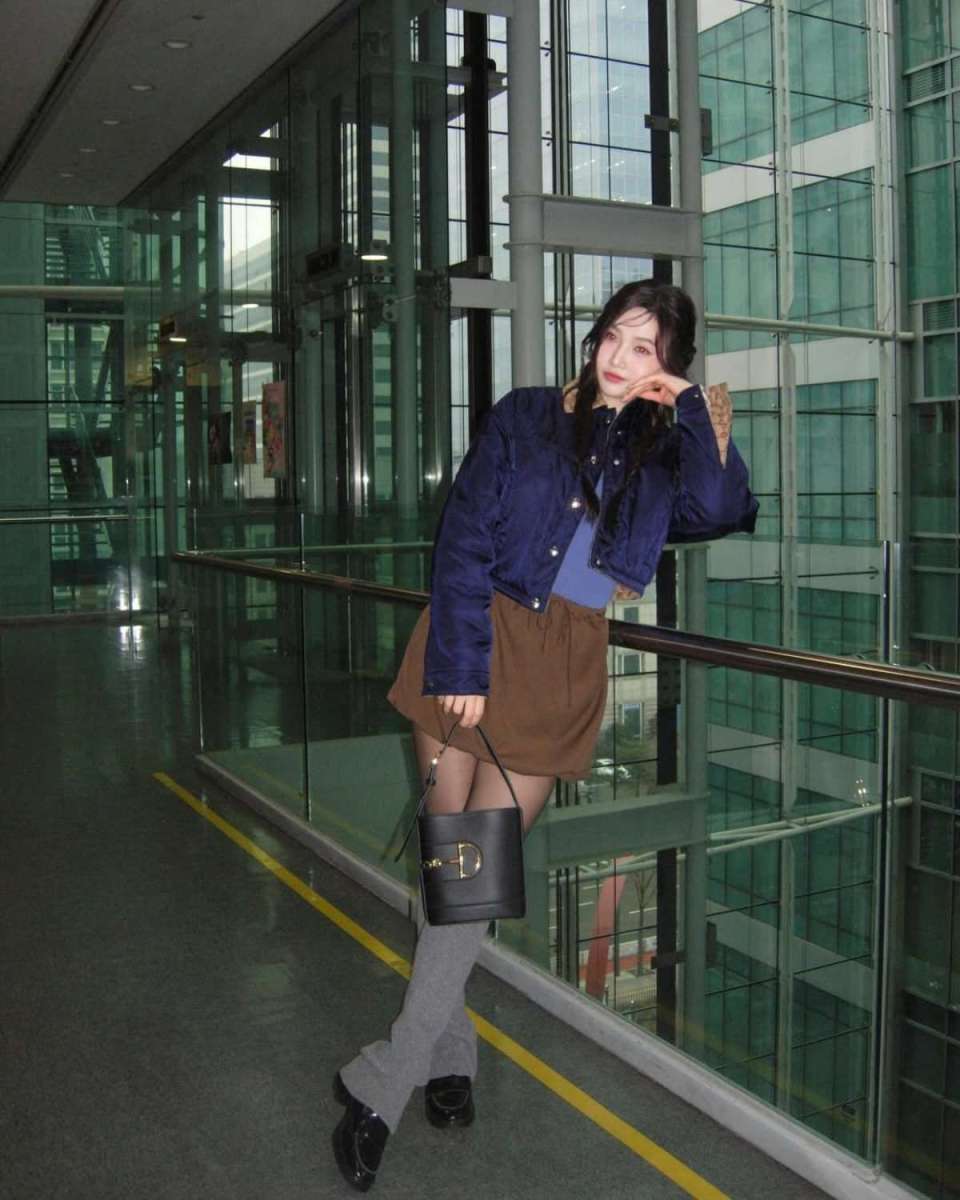 브라운 미니 스커트는 톤을 낮춰 차분하게 맞췄다. 블랙 버킷백은 골드 D 장식으로 세련된 느낌을 더했다.