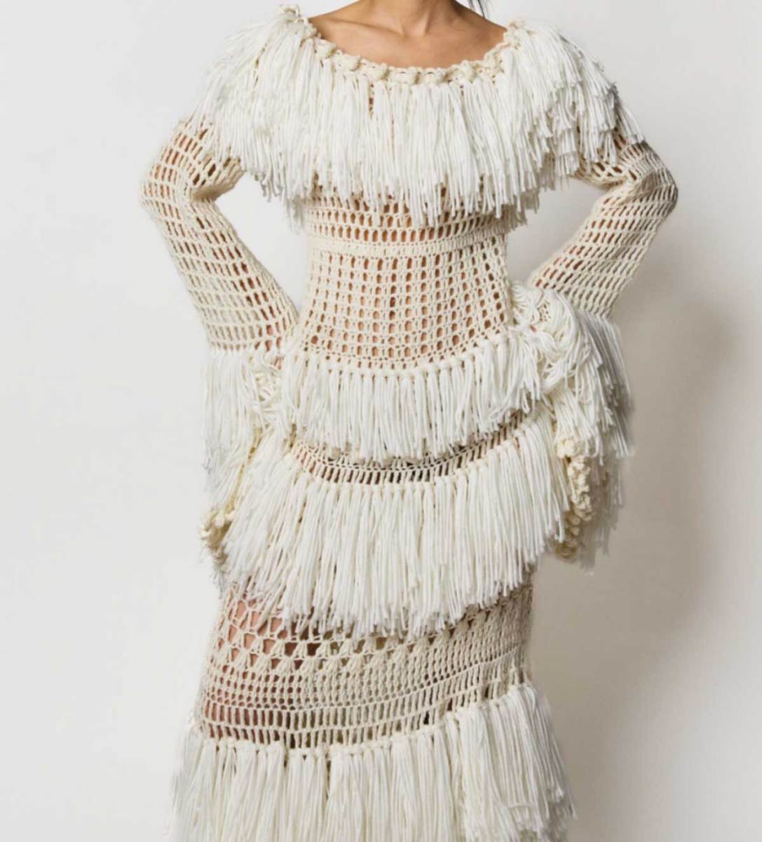 이효리가 입은 하얀 드레스는 ‘줄라이컬럼(JulyColumn)’의 핸드크래프트 컬렉션 제품이다. 전면에 손뜨개 기법이 적용돼 있고, 보트넥 라인을 따라 길게 늘어진 프린지가 어깨선을 타고 흘러내린다. 상체는 격자형 짜임으로 은근히 비치는 시스루 형태다. 허리 라인은 정교한 뜨개 패턴으로 몸의 곡선을 부드럽게 감싸며, 하단은 프린지로 마무리돼 입체감을 준다. 한눈에 봐도 대량 생산된 옷이 아니라는 걸 알 수 있다.