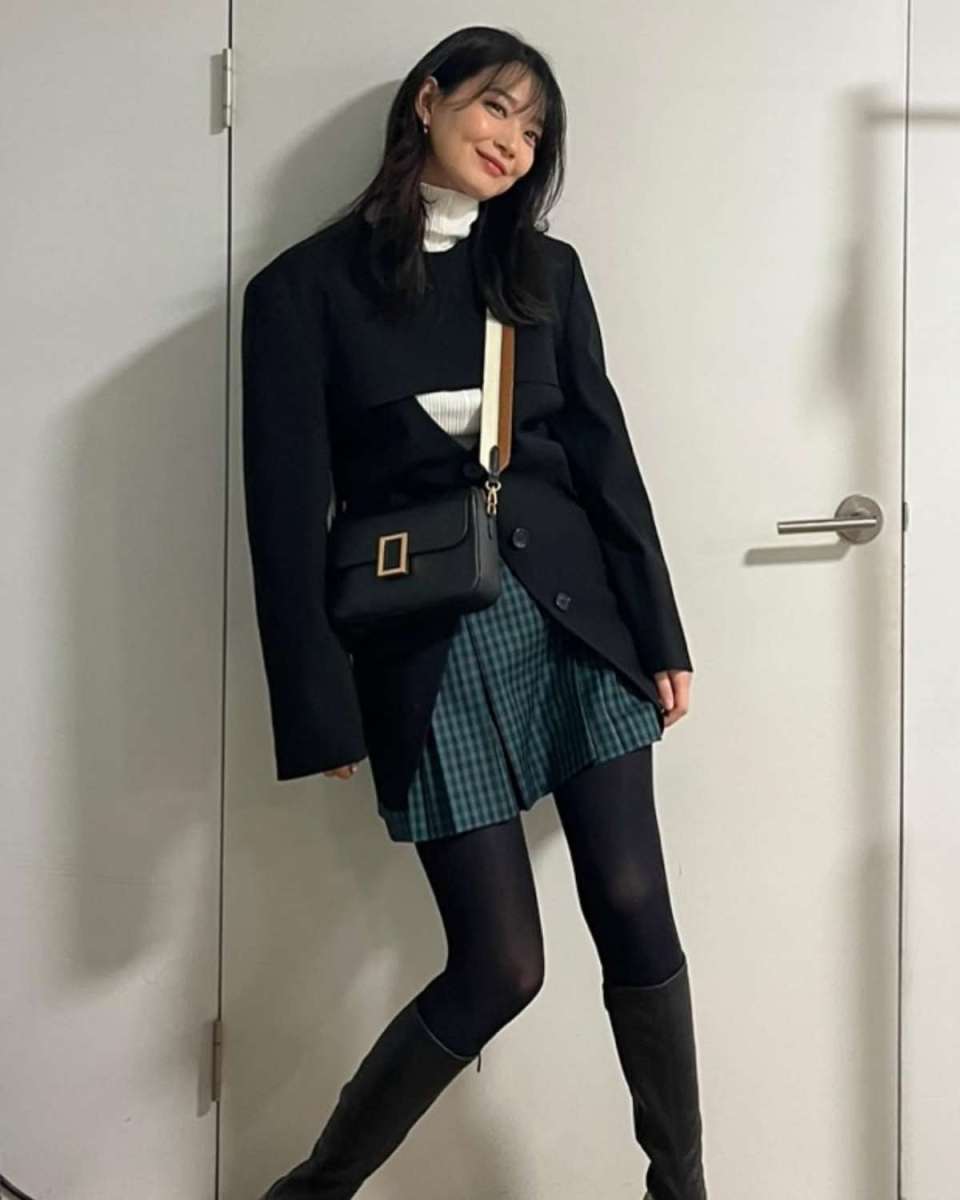 첫 번째 패션은 블랙 재킷과 체크 미니스커트로 구성됐다. 화이트 폴라티로 밝기를 높이고, 어깨선이 잡힌 재킷으로 상체 라인을 정리했다.