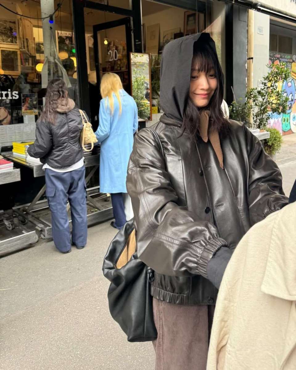 두 번째 패션은 가죽 재킷을 중심으로 한 캐주얼 스타일이다. 브라운 컬러의 가죽 재킷 위에 후드 집업과 셔츠를 겹쳐 입었다. 기본 아이템을 활용해 실용적이다.