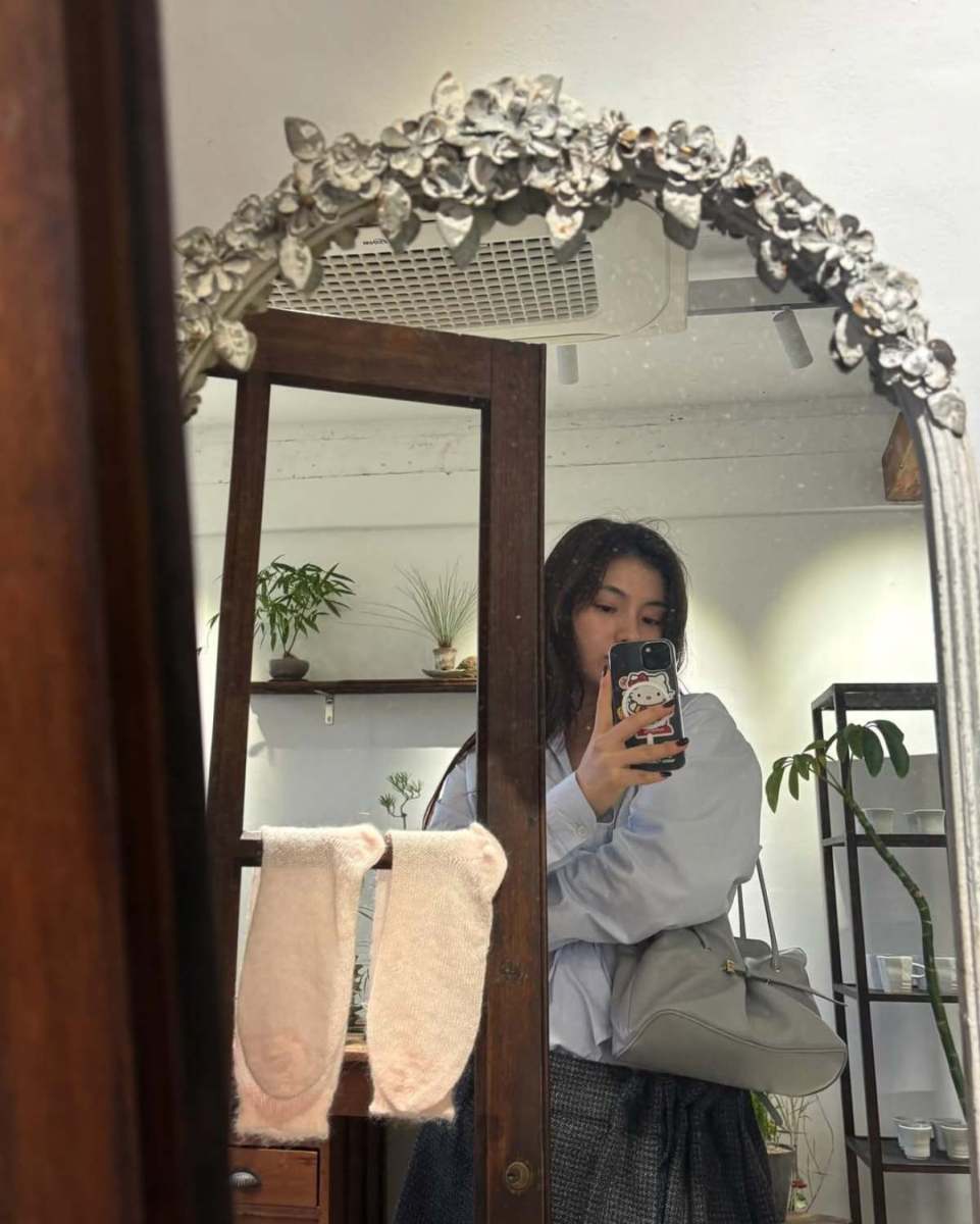 밝은 셔츠가 상단을 가볍게 살리고 스커트의 톤이 전체 분위기를 차분하게 만든다. 검은색 세로 무늬 스타킹은 다리를 길어 보이게 하며, 은은한 광택의 로퍼가 깔끔함을 더한다. 여기에 연회색 가방이 전체 색감을 부드럽게 조율해 정리된 마무리를 만든다.