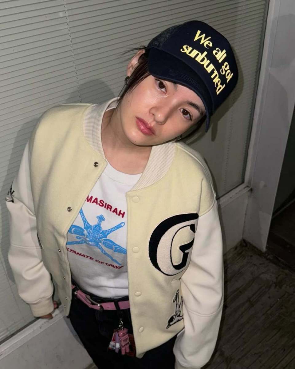 세 번째 패션은 밤거리를 배경으로 한 스트리트 룩이다. 오버핏 스타디움 재킷 위에 흰색 그래픽 티셔츠를 입고, 검은색 와이드 팬츠를 매치했다.