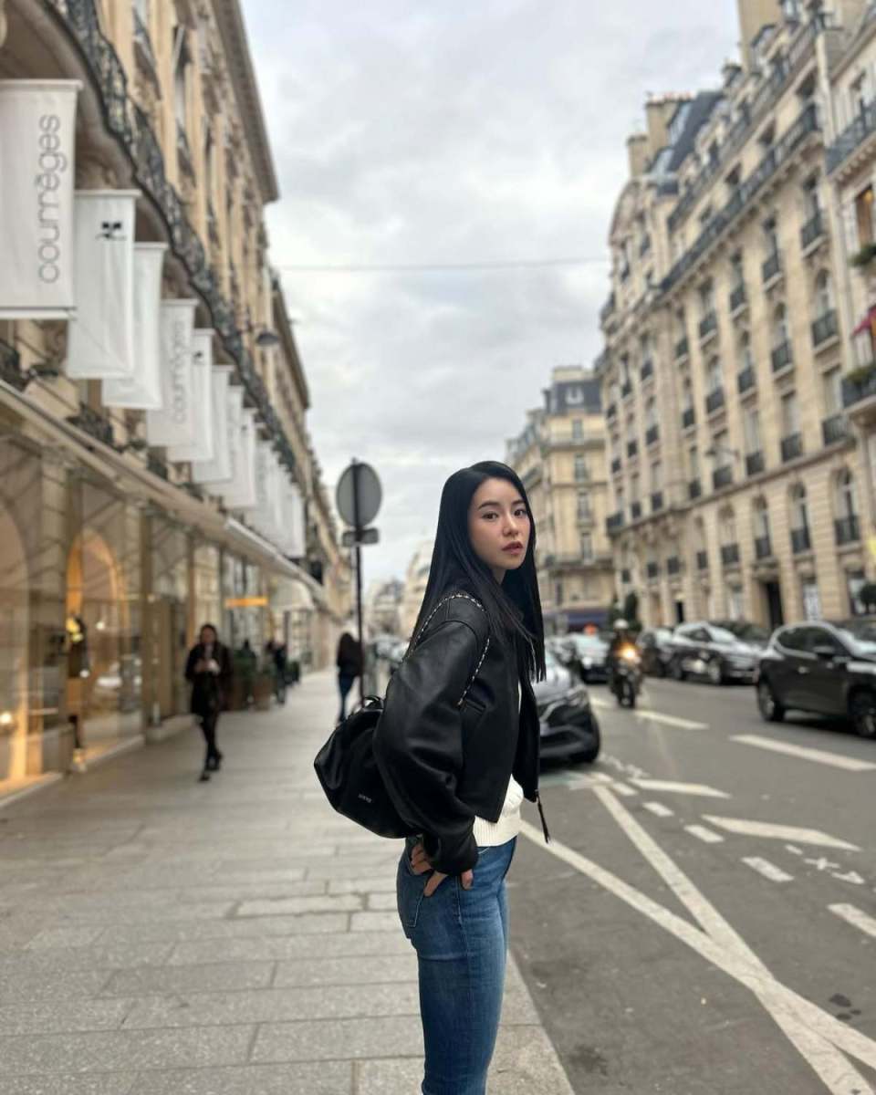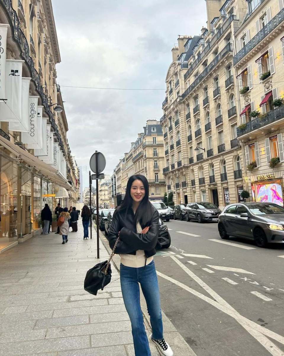 두 번째 옷차림은 파리 거리에서 촬영된 블랙 레더 재킷이다. 블랙 재킷 안에는 크림색 상의를 입고 중청 데님으로 마무리했다. 색 구분이 명확해 얼굴이 한층 또렷해 보인다.