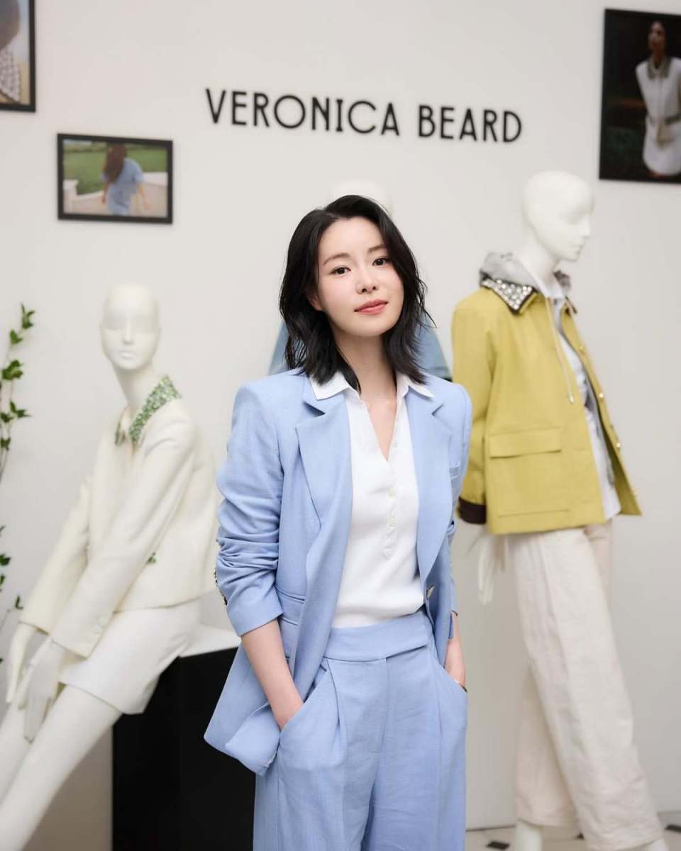 세 번째 옷차림은 행사장에서 선보인 하늘색 슈트다. 상의와 하의 모두 파스텔블루 톤으로 통일해 눈에 잘 띈다. 싱글 버튼 재킷과 와이드 슬랙스로 구성됐으며 안에는 흰 셔츠를 매치했다.