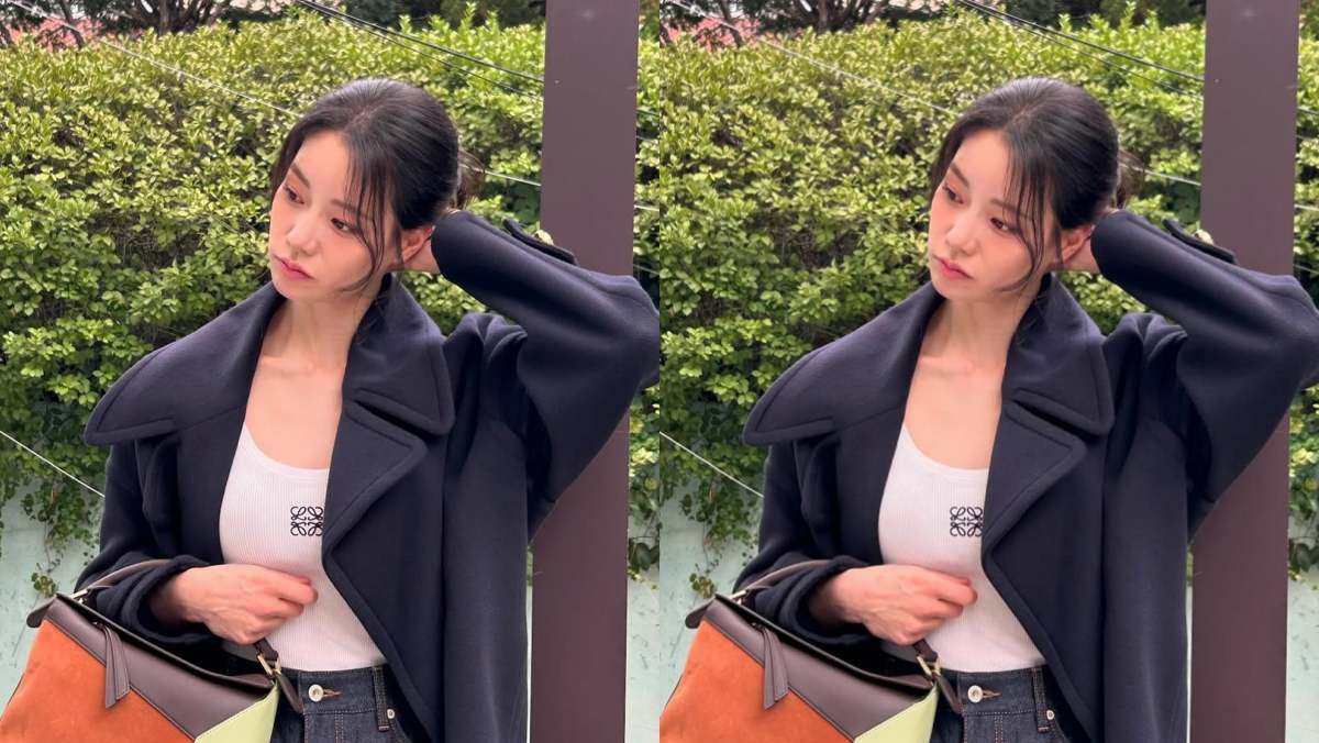재킷의 버튼이 허리선 부근에 위치해 비율이 한결 안정적이고 팬츠가 길어 다리가 훨씬 길어 보인다. 블랙 토트백으로 마무리해 깔끔하게 정리했다.